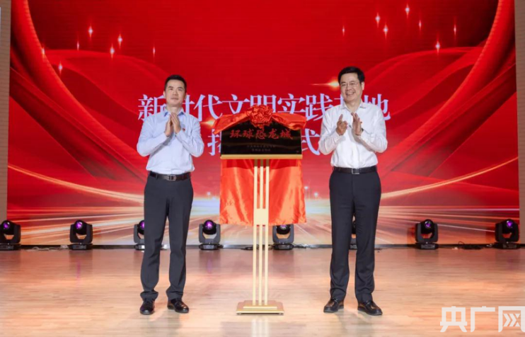 常州市委常委、宣傳部部長(cháng)陳濤(右)與恐龍園文化旅游集團黨委書(shū)記、董事局主席、首席執行官沈波(左)共同為環(huán)球恐龍城“新時(shí)代文明實(shí)踐基地”揭牌(央廣網(wǎng)發(fā) 恐龍園集團供圖)