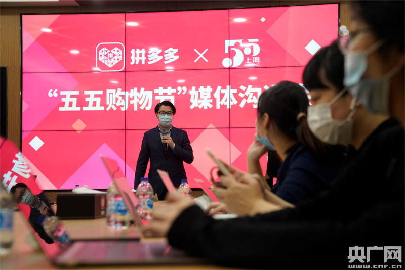 4月23日,拼多多宣布,將投入15億元現金及補貼,聯(lián)合10000家上海品牌和企業(yè),全力支持上海市“五五購物節”。拼多多高級副總裁王堅正在介紹平臺助力“五五購物節”的具體舉措。(本文圖片:央廣網(wǎng)發(fā) 李勝 攝)