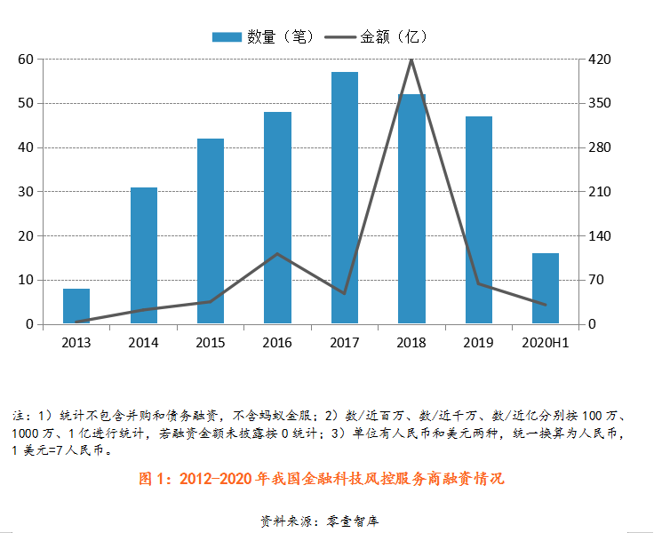 據報告數據顯示,2013-2019年間我國金融科技風(fēng)控廠(chǎng)商融資事件數整體呈逐年上升的趨勢,2017年達到峰值,融資事件為57起;但從2018年開(kāi)始,連續兩年出現下滑趨勢,2019年融資事件數為47起。融資金額整體呈現增長(cháng)趨勢,2018年披露事件的融資總額最高,為418.6億元,2019年融資金額為63.5億元。