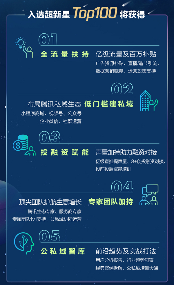 參與“域見(jiàn)超新星”計劃的新銳品牌,將獲得騰訊及生態(tài)伙伴共同帶來(lái)的“全流量扶持、低門(mén)檻建私域、投融資賦能、專(zhuān)家團隊加持、公私域智庫”五大扶持措施,覆蓋新銳品牌在全商業(yè)生命周期中不同階段所需的能力與資源建設,讓品牌快速跑通騰訊交易場(chǎng)內的長(cháng)期商業(yè)鏈路,步入增長(cháng)正軌。