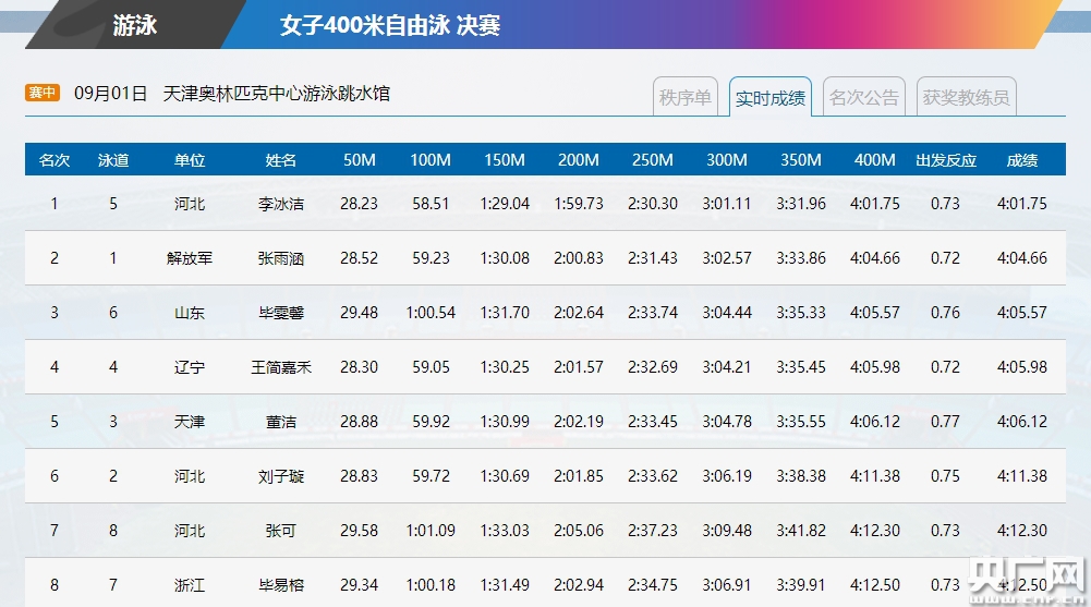 關(guān)鍵詞: 李冰潔;冠軍;女子400米自由泳;全運會(huì )