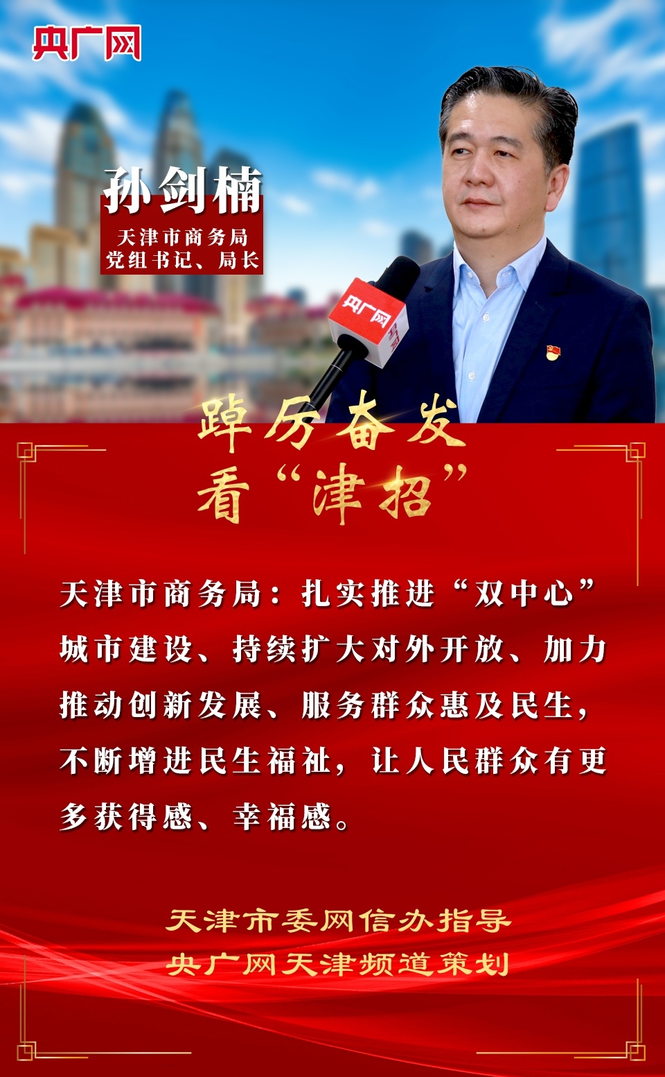 日前,記者就天津市商務(wù)局如何以實(shí)際行動(dòng)推動(dòng)黨的二十大精神在天津商務(wù)領(lǐng)域落地生根等問(wèn)題,對天津市商務(wù)局黨組書(shū)記、局長(cháng)孫劍楠進(jìn)行獨家專(zhuān)訪(fǎng)。