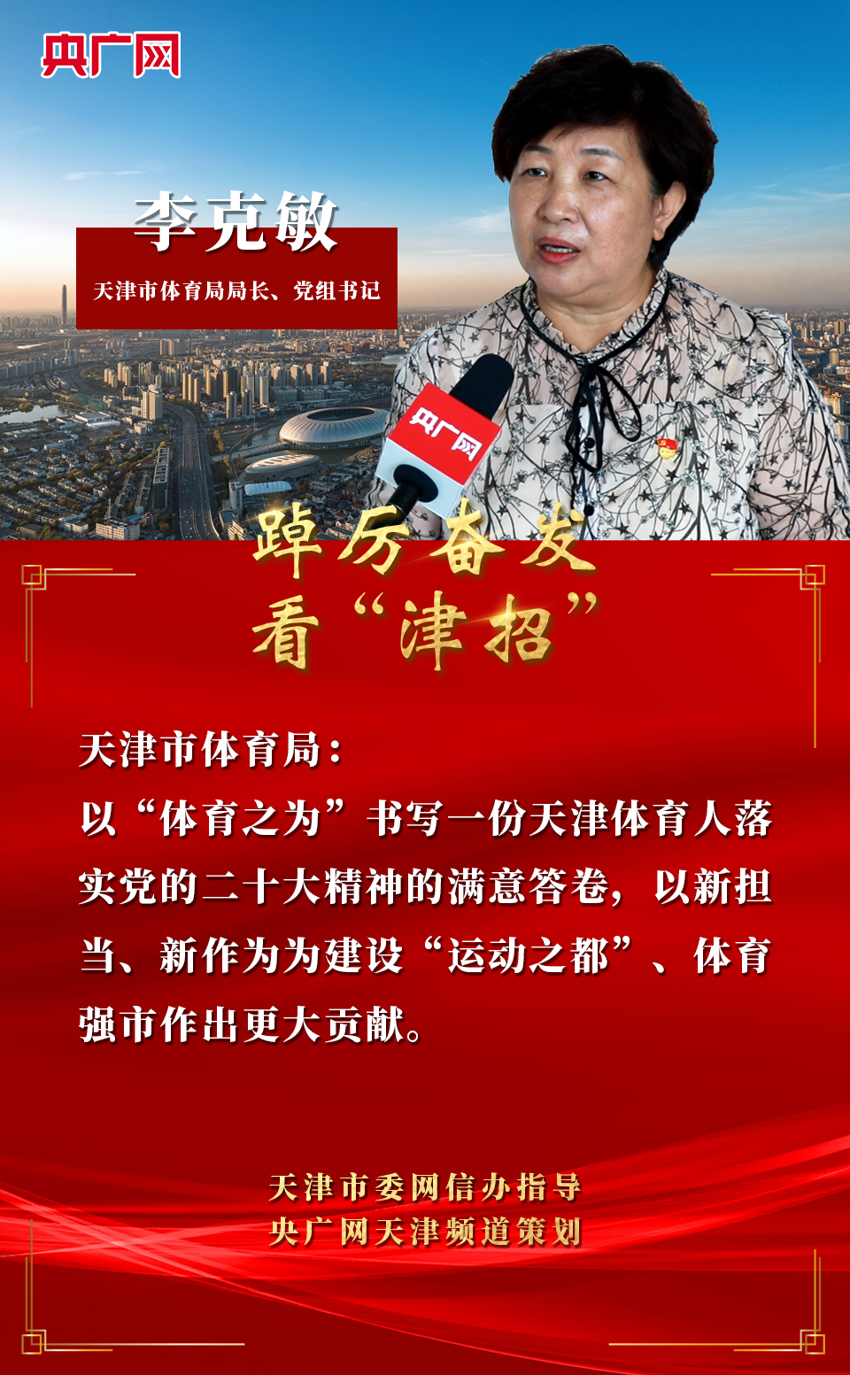 天津市體育局將繼續以“耕”的精神、“闖”的勁頭、“實(shí)”的作風(fēng),發(fā)揮好體育工作“八項舉措”,切實(shí)推動(dòng)“十項行動(dòng)”見(jiàn)成效,以“體育之為”書(shū)寫(xiě)一份天津體育人落實(shí)黨的二十大精神的滿(mǎn)意答卷。