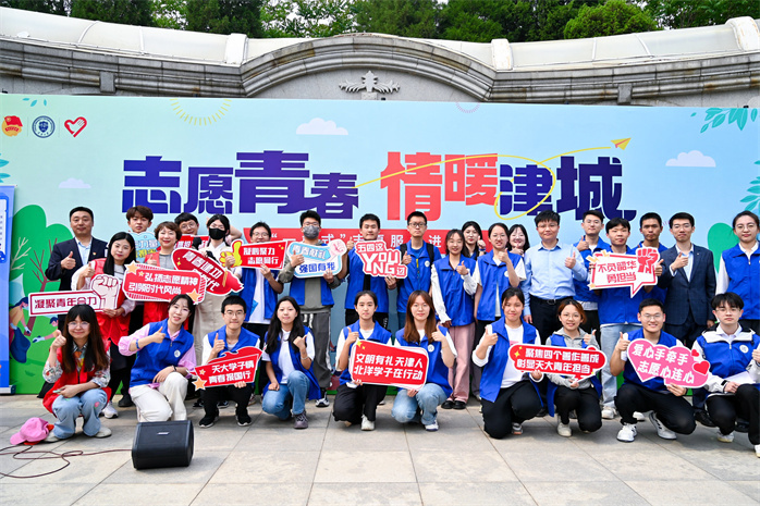 日前,在天津市和平區五大道街睦南公園,一個(gè)個(gè)志愿服務(wù)攤位交織相連,身穿“北洋藍”的天津大學(xué)師生組成一道靚麗風(fēng)景線(xiàn),吸引居民游客紛紛駐足打卡。