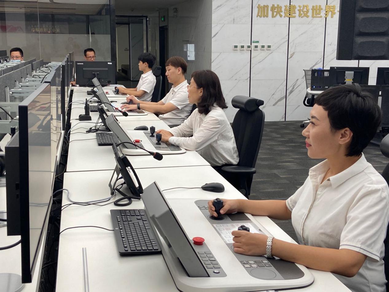 天津港智慧港口的建設也改變了港口人的工作方式。遠程自動(dòng)化操控司機丁亞楠(右一)在中央控制室遠程控制集裝箱的裝卸,每天可以完成最多660個(gè)集裝箱的抓取。右五為丁亞楠丈夫張洪宇。(央廣網(wǎng)記者 李欣 攝)