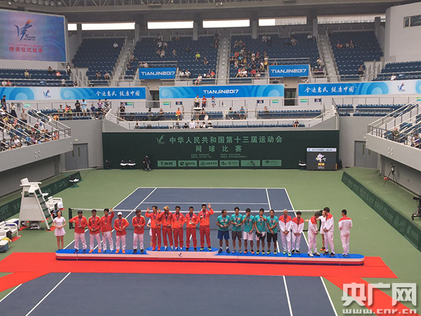 6月18日,第十三屆全運會(huì )網(wǎng)球團體賽決賽在天津網(wǎng)球中心舉行。江蘇隊奪得男子組冠軍,天津隊奪得女子組冠軍。男子組最后決勝隊伍江蘇隊與浙江隊實(shí)力相近,最后以江蘇隊雙打配合優(yōu)勢險勝浙江隊。而女子組團體賽天津隊以?xún)擅麑?shí)力戰將張帥、彭帥,兩場(chǎng)單打以明顯優(yōu)勢奪得冠軍。