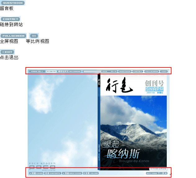 1、雜志的功能按鈕:分布在雜志頁(yè)面最上面和最下面的導航欄。