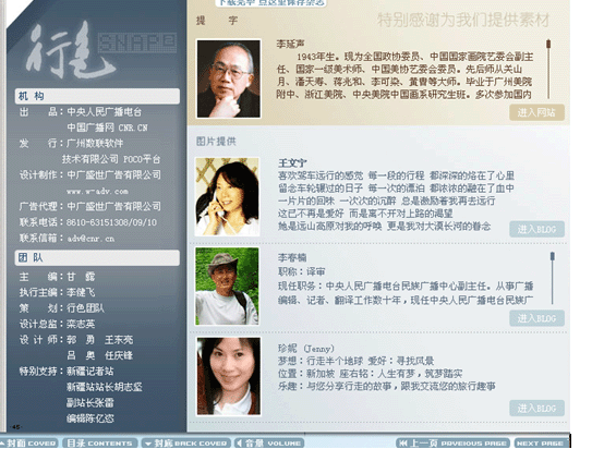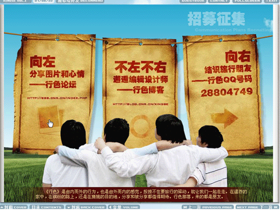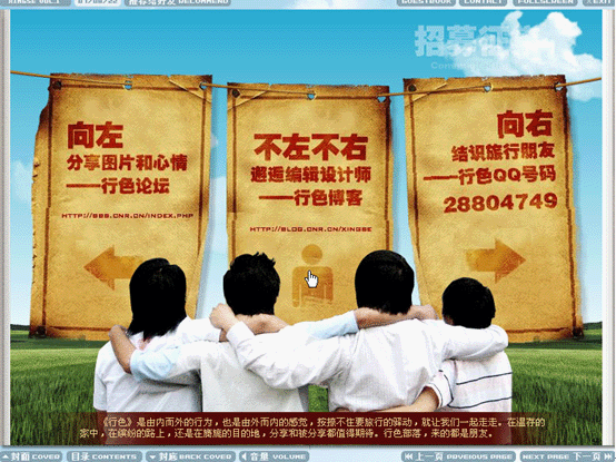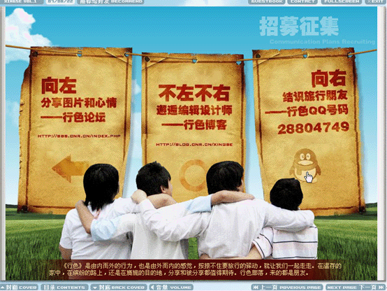電子雜志是運用flash制作方式將音頻、視頻、圖片、文字及動(dòng)畫(huà)等集成,通過(guò)多媒體形式呈現閱讀元素,并且通過(guò)網(wǎng)絡(luò )下載和在線(xiàn)閱讀,由于具有翻頁(yè)瀏覽功能,故名電子雜志。一本電子雜志小則幾兆,多則幾十或者上百兆,使用一般配置的計算機和寬帶網(wǎng)絡(luò )都能流暢下載和閱讀。一般電子雜志網(wǎng)站都提供客戶(hù)端訂閱器,供雜志的定期下載與訂閱,而訂閱器多采用流行的P2P技術(shù)來(lái)提高下載速度。作為web2.0的代表性應用之一,電子雜志有發(fā)行方便,發(fā)行量大,分眾傳播等特點(diǎn)。以下以中國廣播網(wǎng)《行色》電子雜志為例。