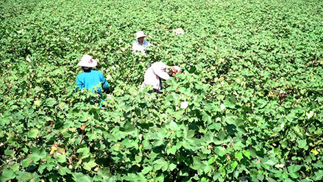 在江西九江市彭澤縣東升鎮桃紅村,村民在棉田里采摘棉花,呈現一片豐收景象。